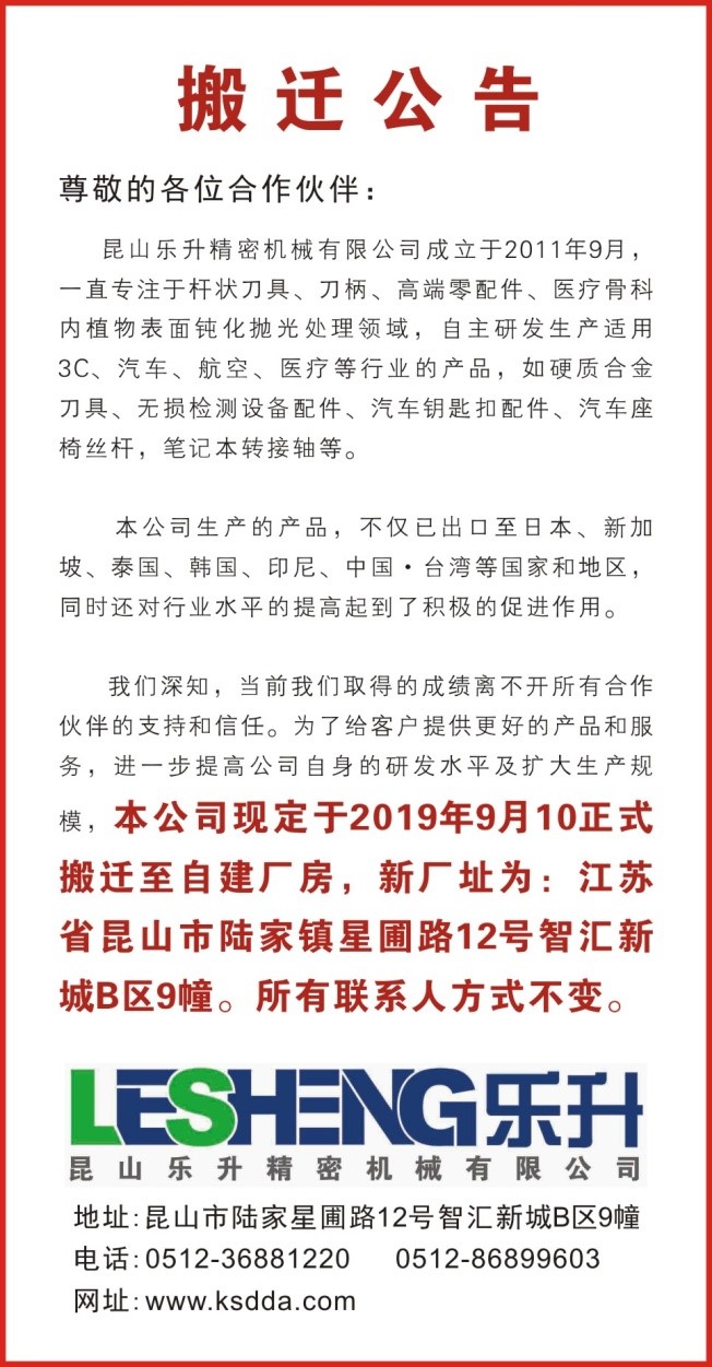 模,本公司现定于2019年9月10正式搬迁至自建厂房,新厂址为:江苏省昆山市陆家镇星圃路12号智汇新城B区9幢。所有联系人方式不变。